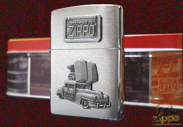 The Zippo car en mémoire de la voiture symbolique de Zippo qui apparu dans presque tous les grands défilés principal du pays en 1948 et 1949 Pour 25 000 $ de l'époque, Armé de ses cheminées jumelles à néon dominant la modeste toiture, cette Chrysler Saratoga de 47 a largement participé à la notoriété de la marque Durant les années 60, la voiture a été laissée à Pittsburgh, agence pour une promotion régionale et a disparue. Pour célébrer le 50ème anniversaire de la voiture cinquantième, Zippo a fait réaliser une reproduction exacte Zippo a utilisé ce véhicule unique pour créer le collector de cette année qui comprend un ensemble Briquet et porte clés dans une boite décorée. Sont aussi inclus |