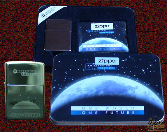 The Millenium one ONE WORLD ONE FUTURE " TITANIUM COATED ", le briquet officiel du nouveau millénaire. Limité à 100.000 exemplaires Il est revêtu de titane (un produit de haute technologie qui donne à la navette spatiale sa résistance thermique) Ce dernier né symbolise parfaitement le millénium. C'est aussi le premier Zippo de l'année où est gravé par ordinateur un message d'espoir : " un monde... Un futur" |